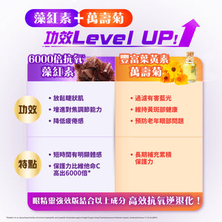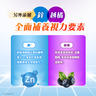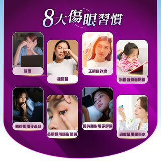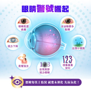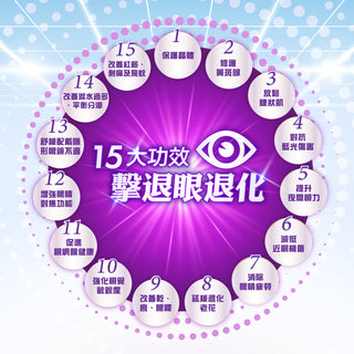 保護晶體 / 修復黃斑部 / 放鬆睫狀肌 / 對抗藍光傷害 / 提升夜間視力 / 減低近視機會 / 消除眼睛疲勞 / 延緩退化、老化 / 改善乾、痕、眼矇 / 強化視覺敏銳度 / 促進視網膜健康 / 增強眼睛對焦功能