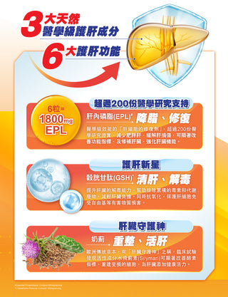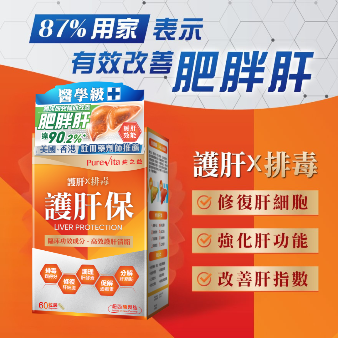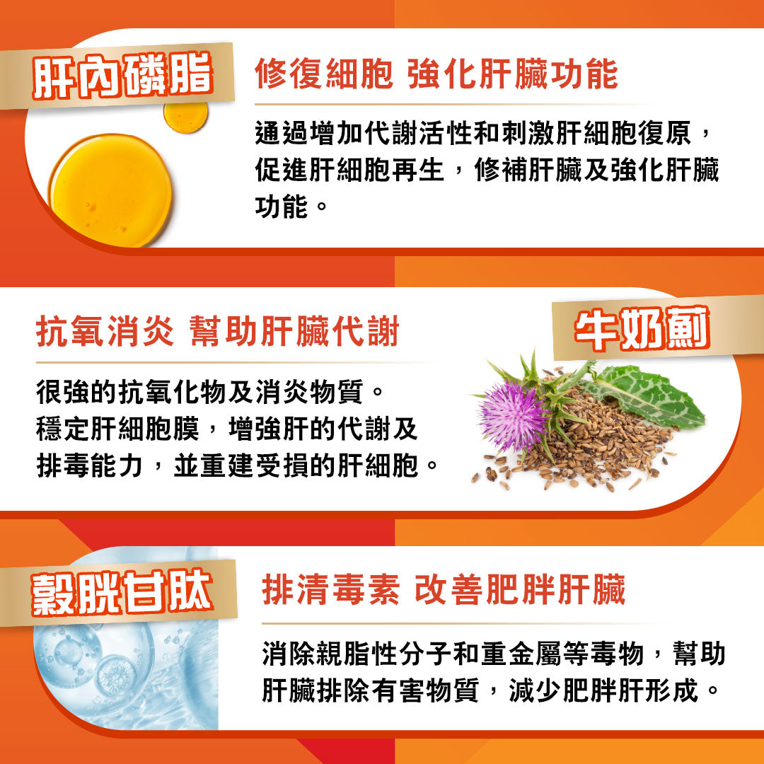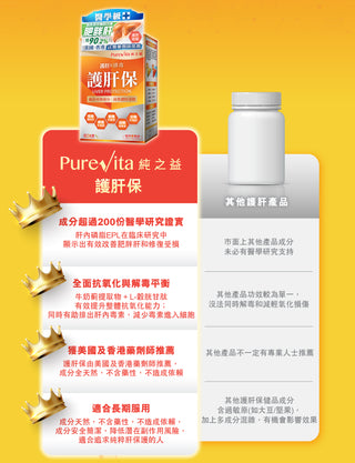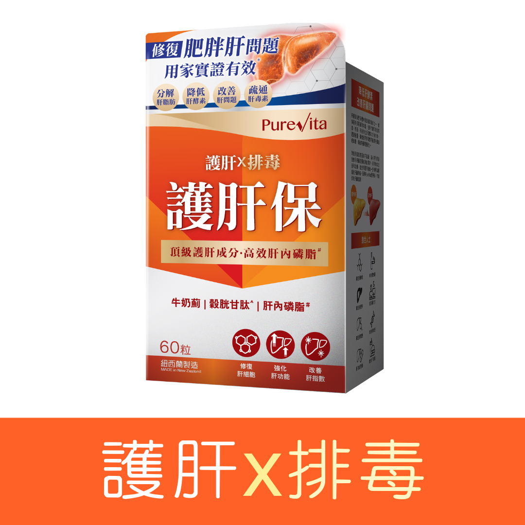 PureVita護肝保選用頂尖的活性成分-牛奶薊萃取,配合穀胱甘肽(GSH)、肝內磷脂等,為受損細胞注入生命力,加強肝臟修復能力、減輕肝損傷、促進肝細胞再生。同時使血液中的肝酵素維持正常水平,減少脂肪積聚,確保肝正常運作,補肝護肝!
